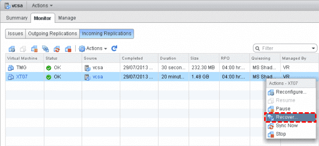7. 访问 vCenter > 监控 > 传入复制 ,右键单击虚拟机,然后单击 恢复 。复制完成后,您可以随时调用灾难恢复。