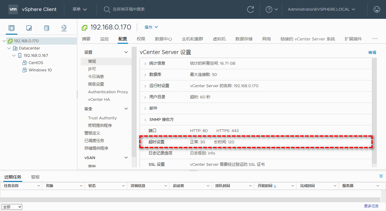 令人高兴的是,从vSphere 7.0中,可以直接在vSphere网页客户端中配置会话超时值。或者,您可以通过更改webclient.properties文件中session.timeout属性的值来配置vSphere会话超时。