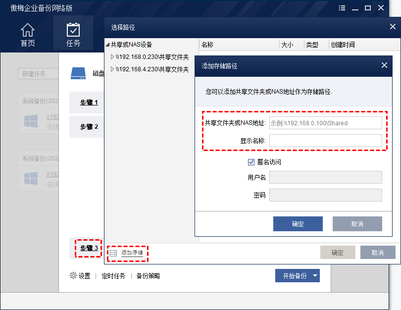 在步骤2中,点击“添加存储”->输入“共享文件夹或NAS地址”->“确定”点击确认。然后,在目标路径上选择一个文件夹来存储备份映像。