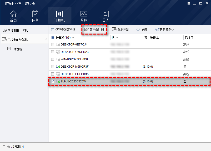 步骤1. 打开傲梅企业备份网络版,点击“计算机”>“已控制的计算机”,找到未注册的计算机,将其选中,然后点击上方的“客户端注册”选项。