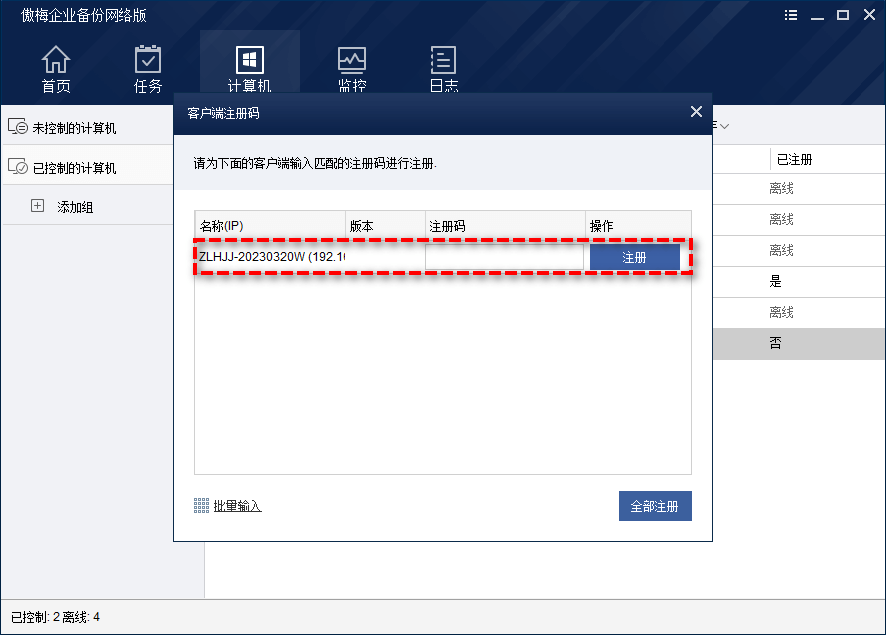 步骤2. 在弹出窗口中输入您的注册码,点击“注册”即可成功注册傲梅企业备份网络版受控端(也支持批量注册)。