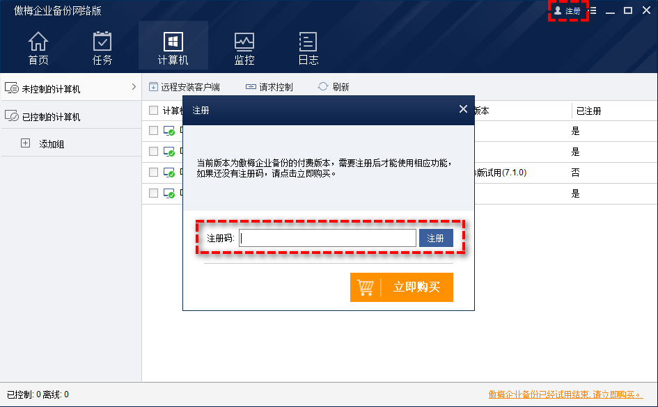 傲梅企业备份网络版是一个集中备份软件,通过一个控制端对多个受控端进行批量备份还原任务。所以对于控制端来说,如何使用购买的注册码来完成傲梅企业备份网络版注册任务呢?