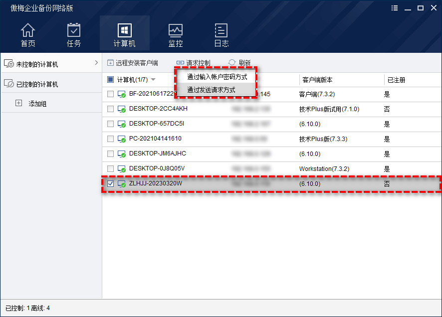 安装完客户端之后,还需要对受控端计算机进行控制,这里您可以点击“计算机”>“未控制的计算机”>“找到您想要控制的受控端计算机”,然后选择“请求控制”以完成控制连接(如果您在未控制的计算机中没有找到目标计算机的话,可能是因为受控计算机与控制计算机所在的子网不同,您可以手动添加IP段来解决此问题)。