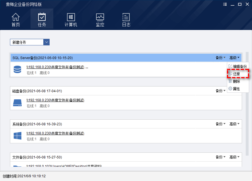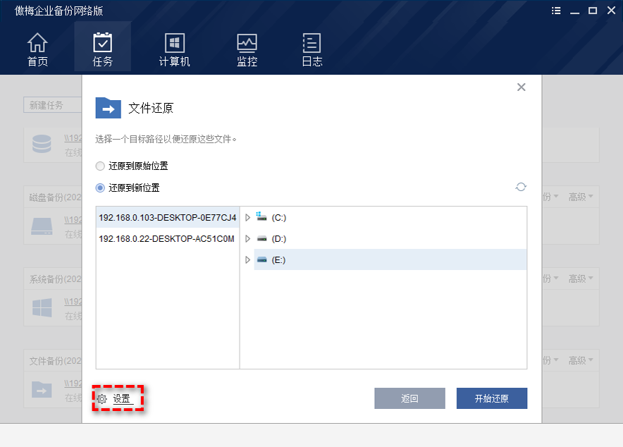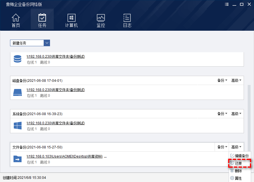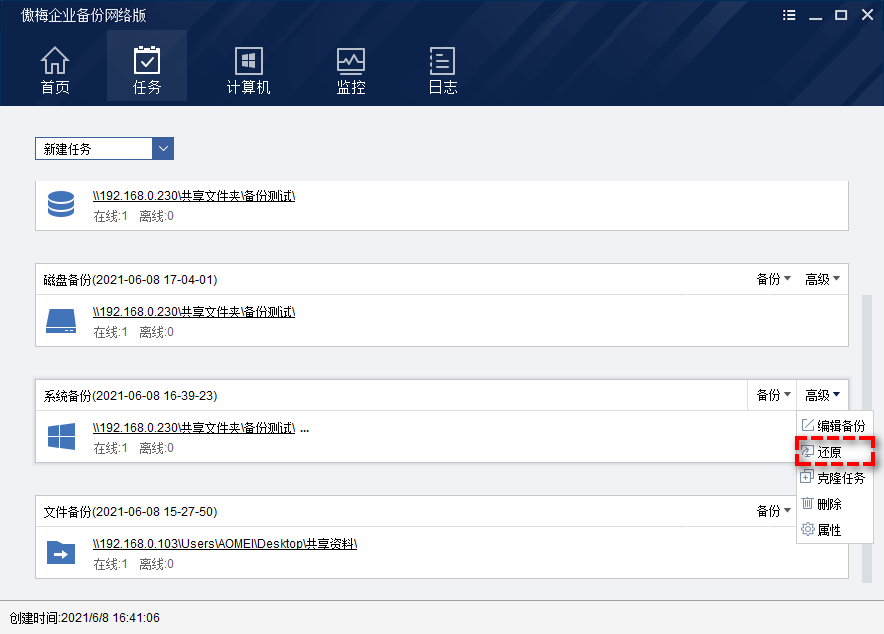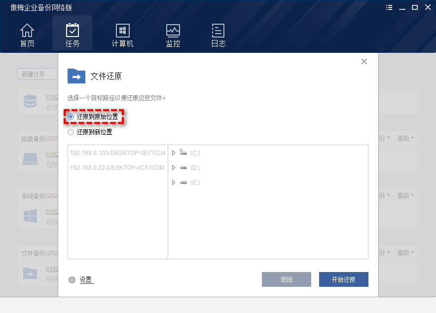 傲梅企业备份网络版的还原功能可以帮助您轻松地将备份镜像还原到原始计算机或者其他受控客户端计算机。