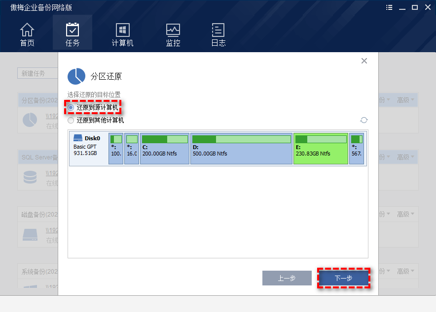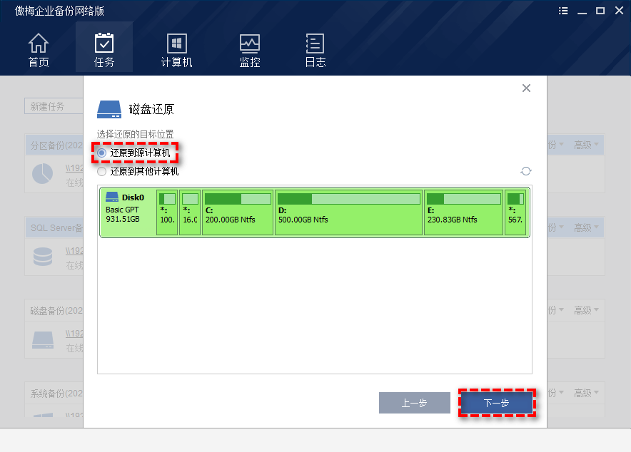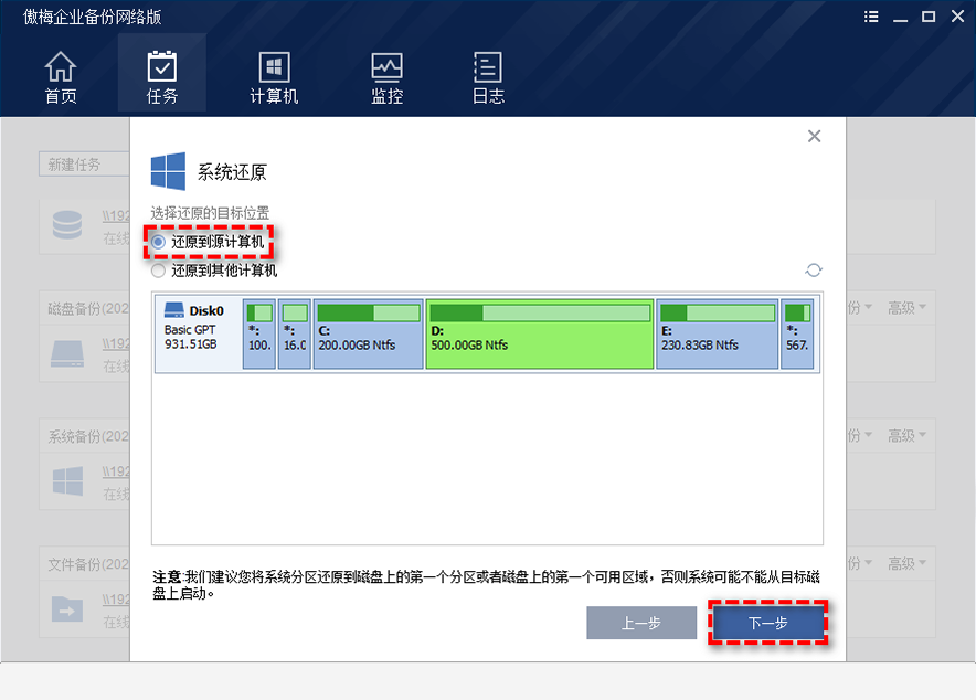 步骤4. 您可以选择“还原到源计算机”以将分区备份还原到源计算机,并选择某个指定分区或者磁盘作为还原目标路径。