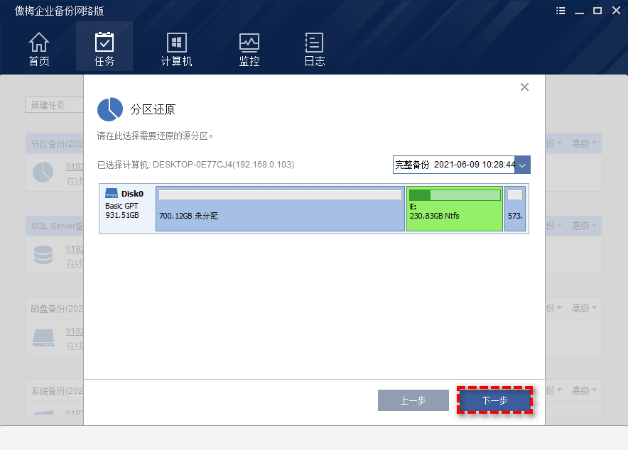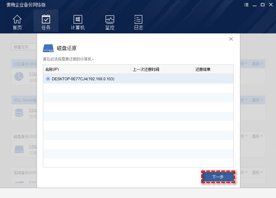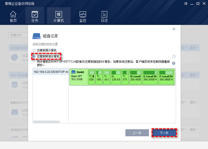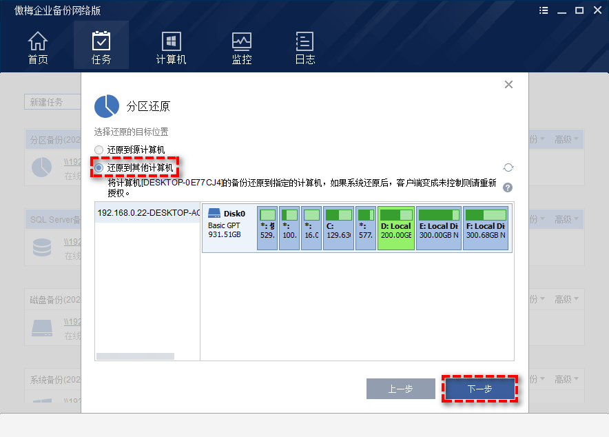 如果您的傲梅企业备份网络版已经控制了多台客户端计算机,则可以选择“还原到其他计算机”以将其他客户端计算机上的特定分区作为还原目标路径,然后单击“下一步”。