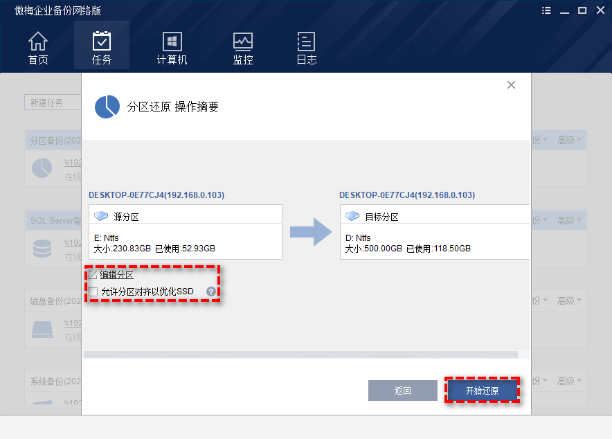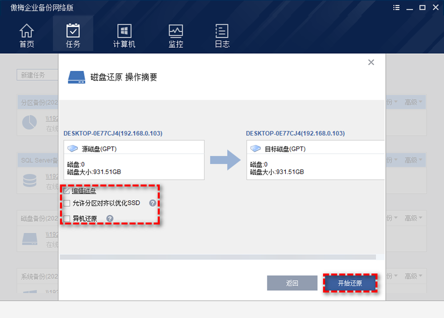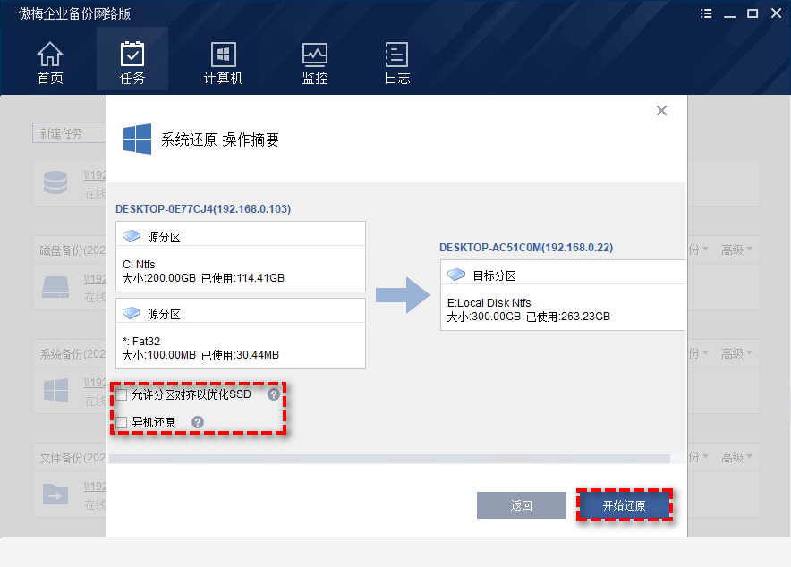步骤5. 在“操作摘要”界面,您可以预览将要执行的操作,确认无误后单击“开始还原”以执行操作。