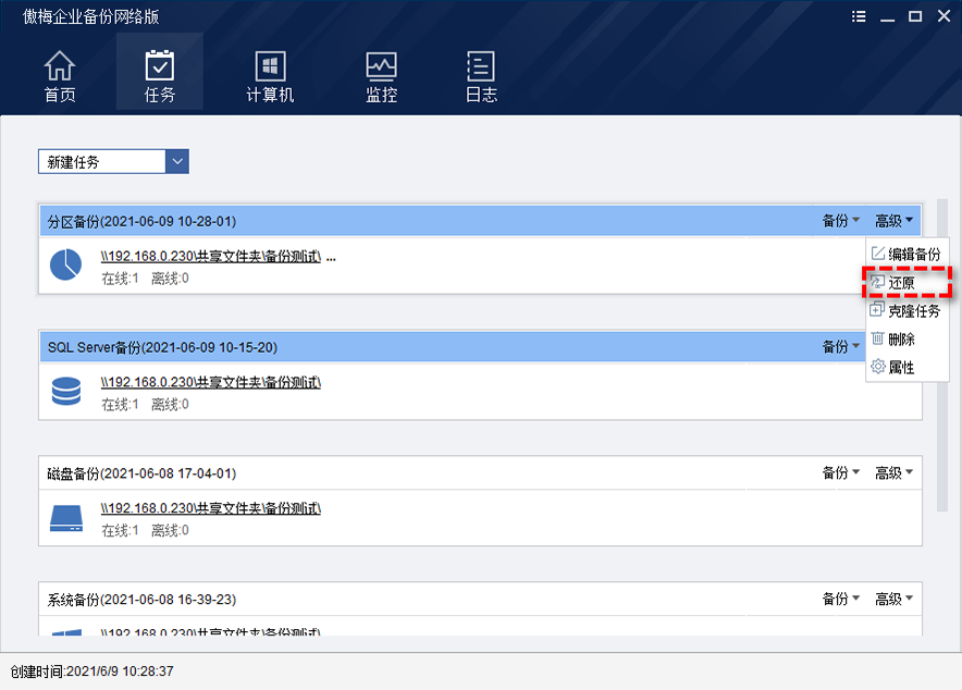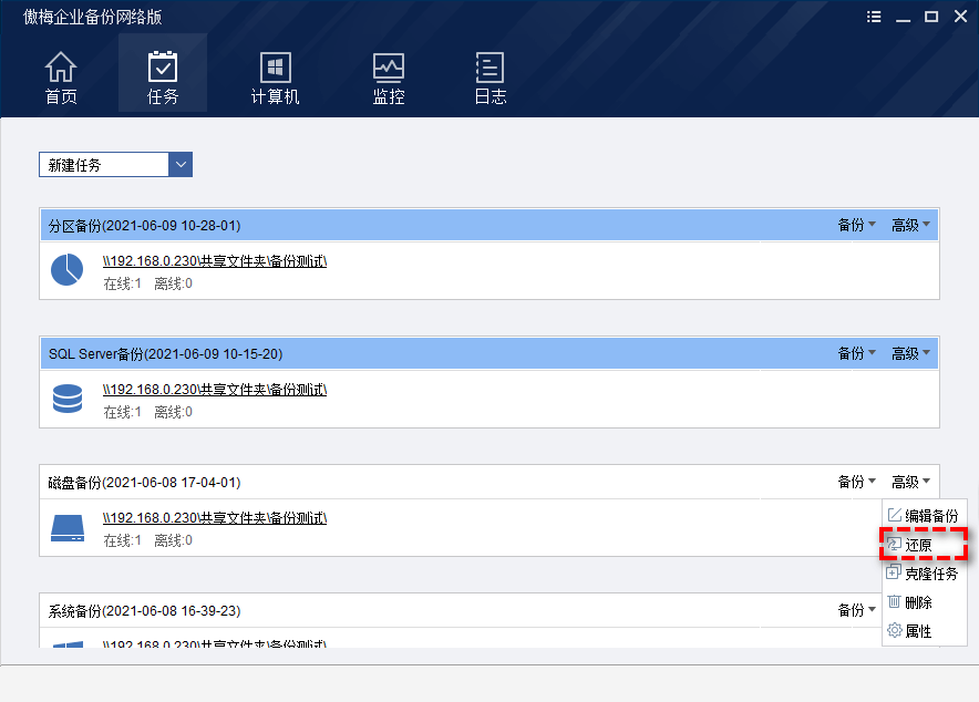 步骤1. 打开傲梅企业备份网络版,单击“任务”选项卡并选择需要还原的分区备份任务,单击“高级”,然后选择“还原”。
