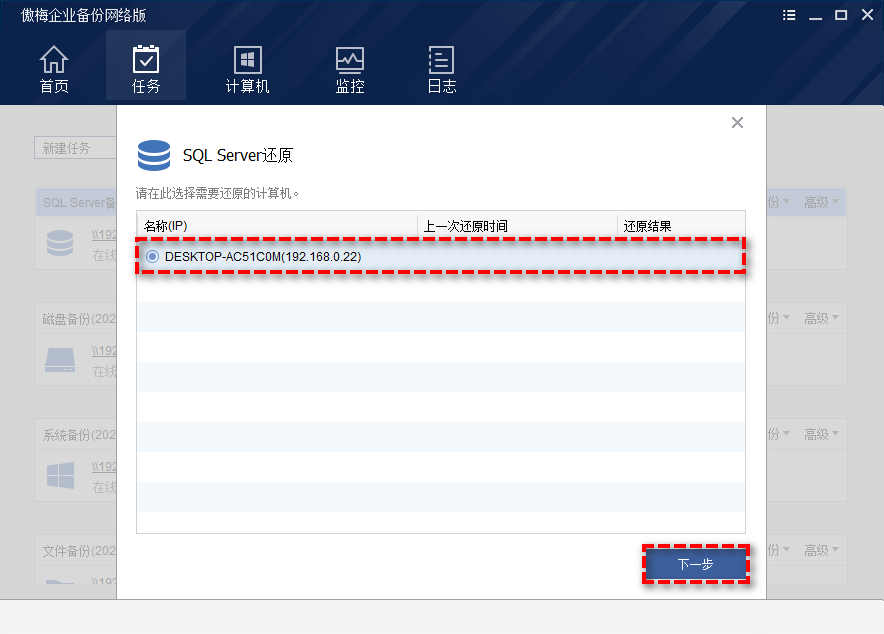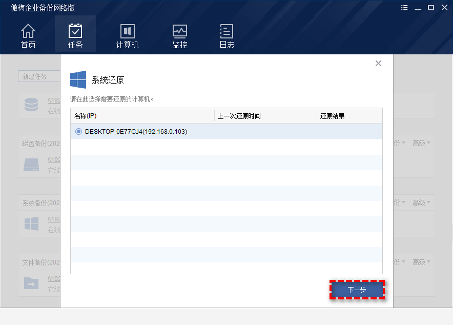 步骤2. 选择需要还原的客户端计算机,然后单击“下一步”。
