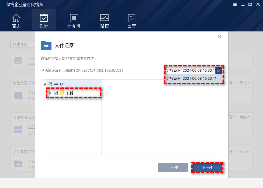 步骤3. 在选择需要还原的文件或文件夹界面,您可以选择指定的某个文件/文件夹,并且在右侧的下拉菜单中您还可以选择需要还原的备份版本,然后单击“下一步”。