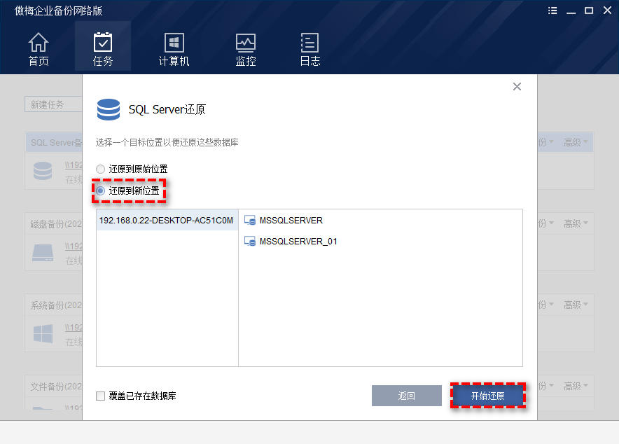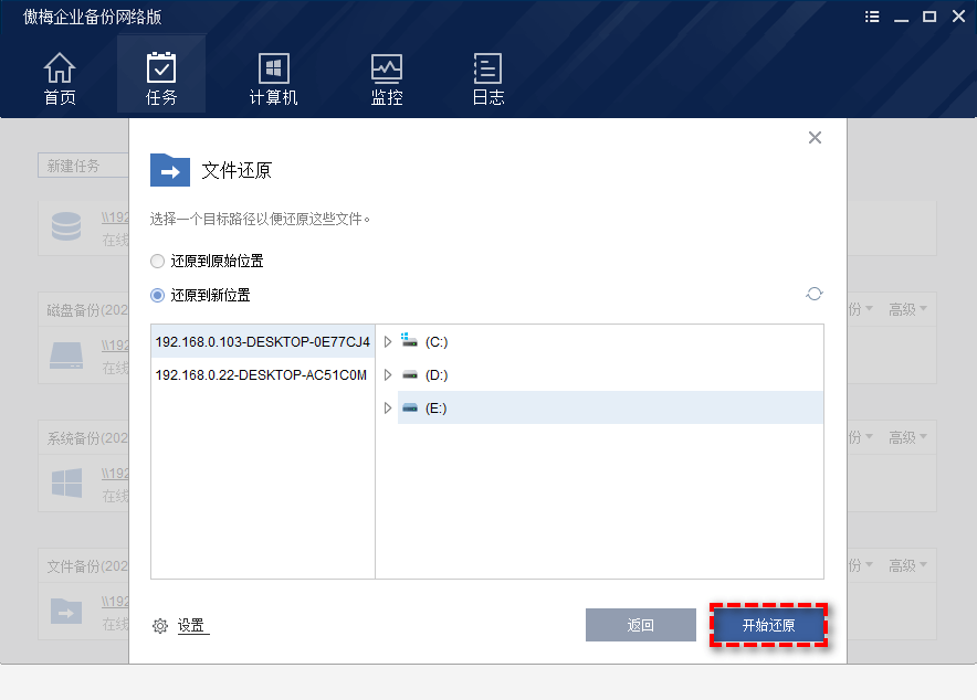 如果您的傲梅企业备份网络版已经控制了多台客户端计算机,则可以选择“还原到新位置”以将其他客户端计算机上的实例位置作为还原目标路径,然后单击“开始还原”以执行操作。