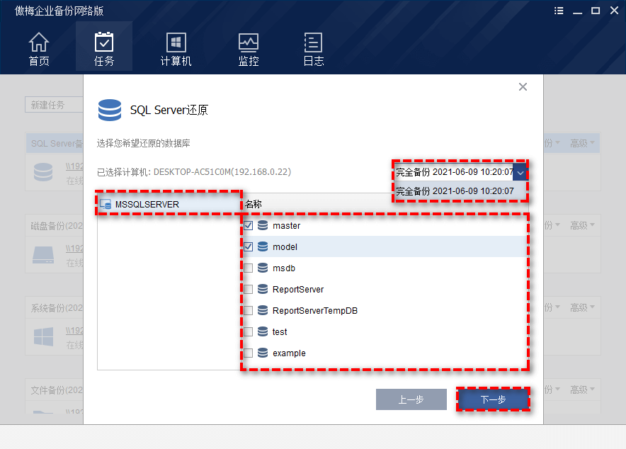 步骤3. 在选择需要还原的数据库界面,选择需要还原的数据库实例或该实例对应的数据库,并且在右侧的下拉菜单中您还可以选择需要还原的备份版本,然后单击“下一步”。