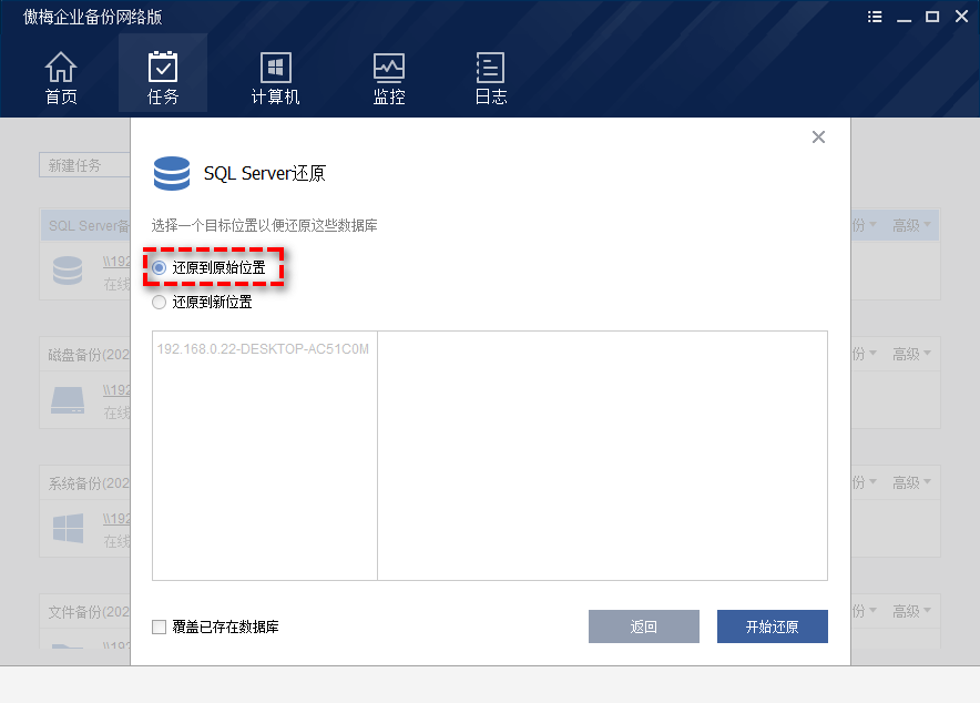 注意:如果您勾选了“覆盖已存在数据库”选项,那么当还原目的地中已经存在同名数据库时,它将被直接覆盖。