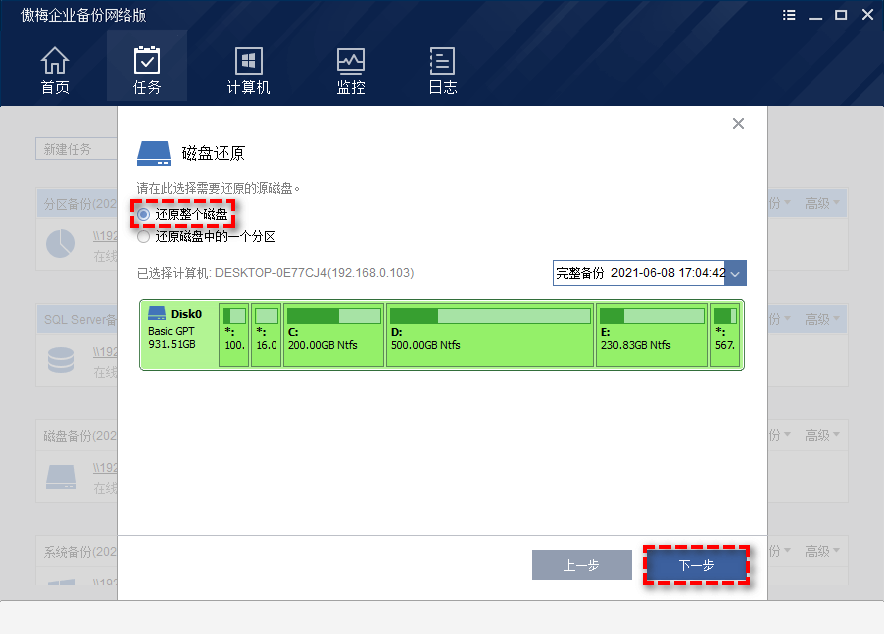 步骤3. 在选择需要还原的源磁盘界面,您可以选择“还原整个磁盘”,或者选择“还原磁盘中的一个分区”仅还原指定分区数据,在右侧的下拉菜单中您可以选择需要还原的备份版本,然后单击“下一步”。