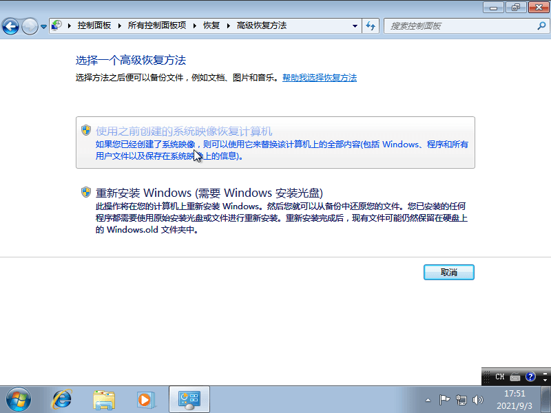 如果您之前创建了系统镜像备份,则只需将计算机恢复到运行良好的较早日期即可。在这种情况下, 轻松实现无光盘无u盘重装系统Windows 7。